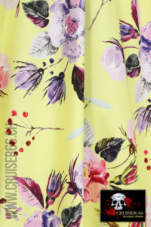 Es erinnert an die helle Sommer Sonne, die prachtvolle gelbe Hintergrundfarbe mit knalligen Effekten in Violett, Pink, Grün und Rot, alles hüsch kombiniert für ein auffälliges Blumendesign.