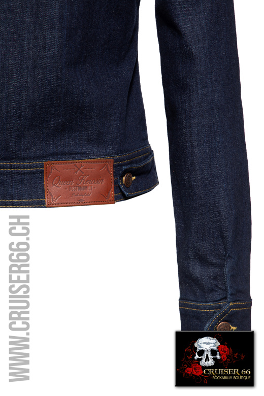 Das typisch dunkle Denim sticht besonders durch seine exklusive Retro Stickerei auf dem Rücken hervor. Markant gesetzte Kontrastnähte betonen das authentische Design, sowie die Vorzüge der femininen Silhouette. Der taillierte, dezente Crop-Cut macht Sie zu einem lässigen, sexy It-Piece in deiner authentischen Rockabilly Kollektion.