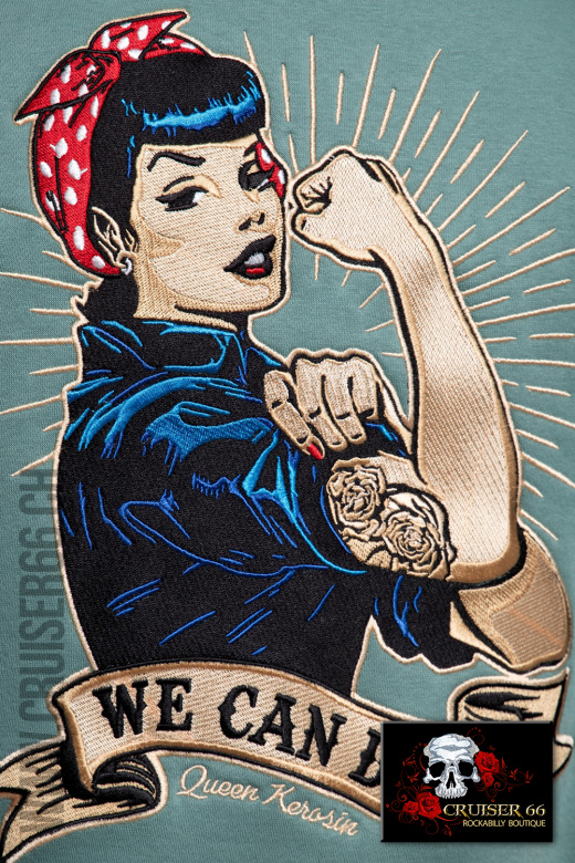 Das Herzstück der Jacke ist jedoch das unübersehbare 'We Can Do It!' Motiv. Es zeigt, dass du eine Frau bist, die weiß, was sie will und wie sie es bekommt, eine moderne Heldin in einer nicht immer einfachen Welt.