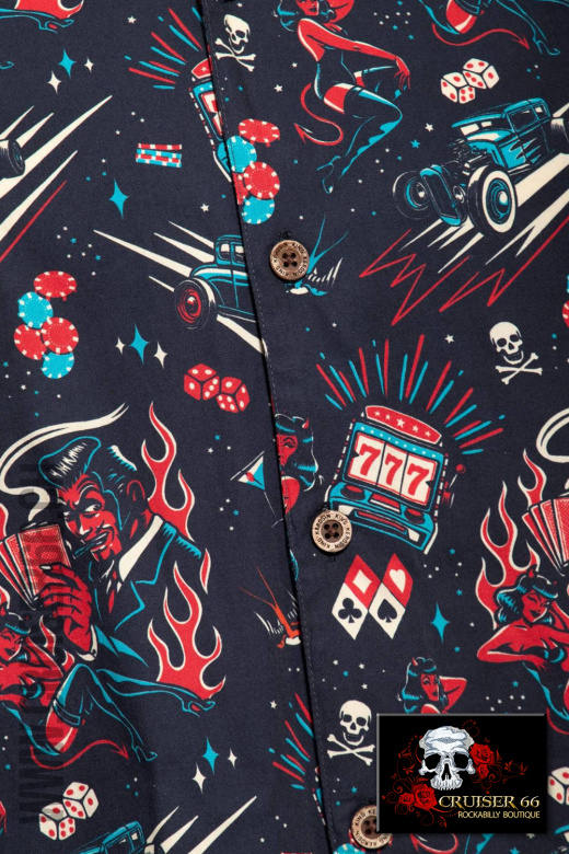 Der auffällige Allover-Print mixt Hotrods, Pin-up-Teufelinnen, Slot-Machines und Skull-Motive zu einem wilden Retro-Cocktail – wie gemacht für Zocker, Rebels und Glücksritter.