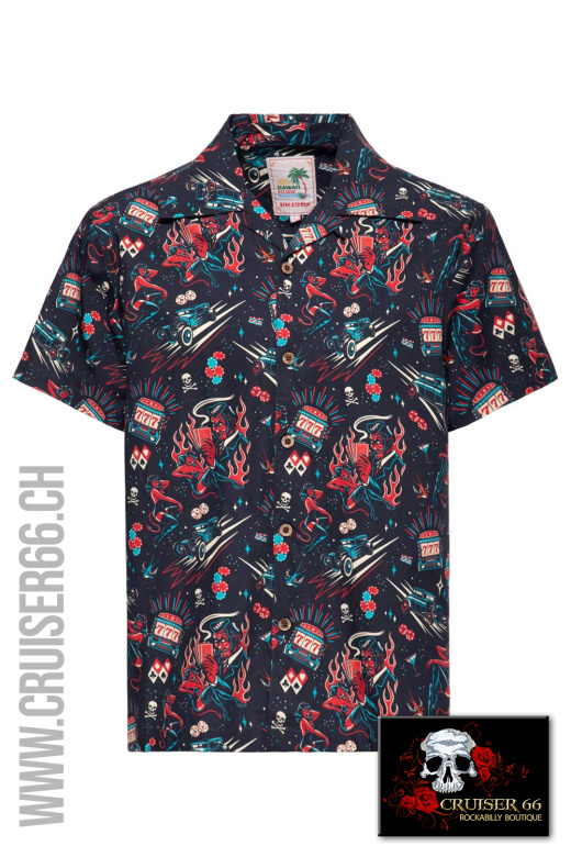 Wenn Flammen, Pokerkarten und heiße Kurven dein Ding sind, ist dieses King Kerosin Hawaii-Hemd genau dein Spiel!