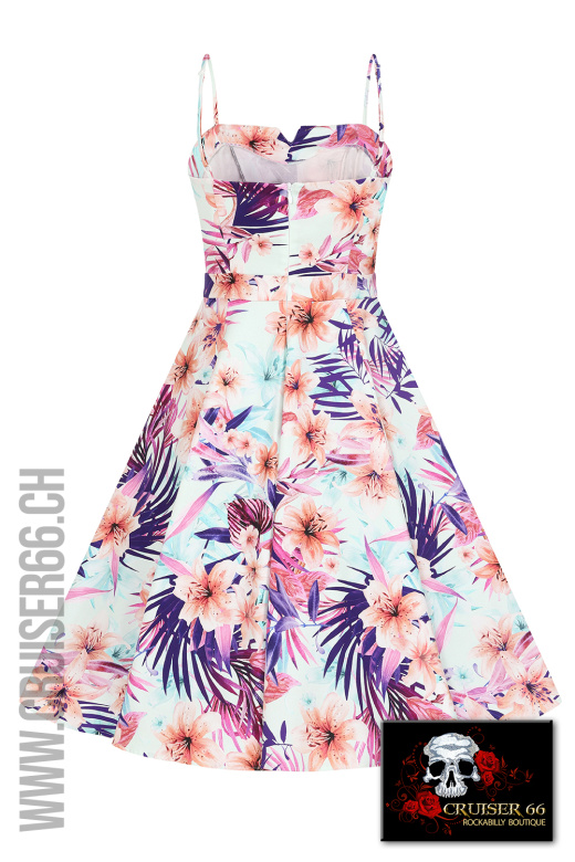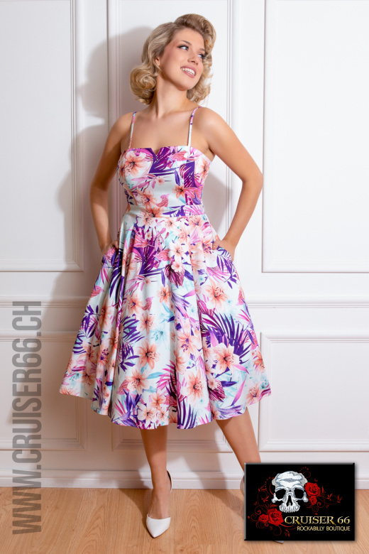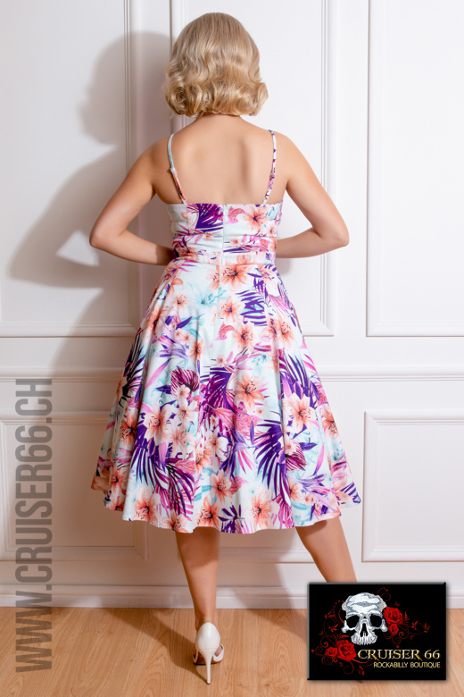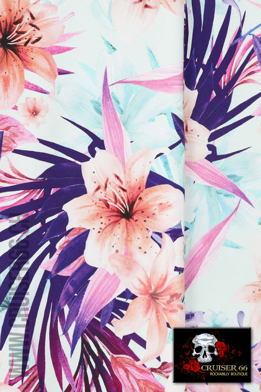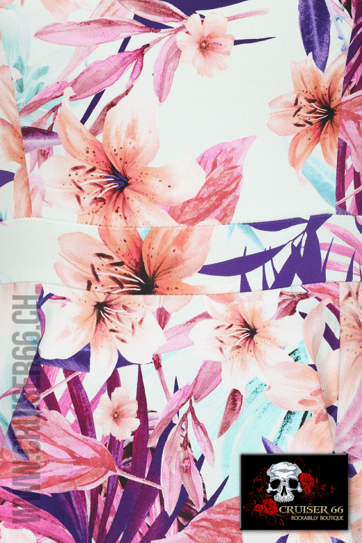 Verwegen und schön, dieser tropische Druck ist perfekt für Sommerabenteuer in der Stadt oder für Spaziergänge im Park. Tropische Blumen und Blätter ziehen alle Blicke der Betrachter an. Gemacht um in der Menge herauszustechen, dieses Modell macht Sie zum Retro Sommertraum.