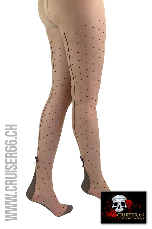 Die Schleife und die Rose verleihen dieser Strumpfhose eine noble Note, der wunderschöne Nude-Farbton verleiht einen schimmernden Look. Ergänzt durch die schwarzen Punkte und die schwarze Rückennaht geben Ihnen diese Strumpfhosen die Möglichkeit, sich sexy zu fühlen!