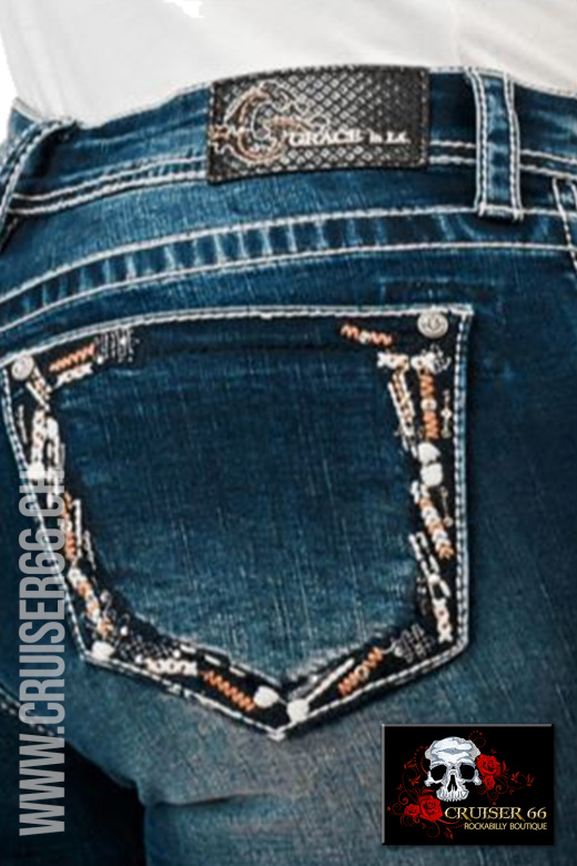 Die elastische Jeans macht eine ausgezeichnete Figur und lässt im Sattel oder im sportlichen Linedance komfortable Bewegungsfreiheit zu. Auch kräftige Cowgirls finden ihre Lieblingsjeans, Grace In L.A. liefert bis Grösse 48.