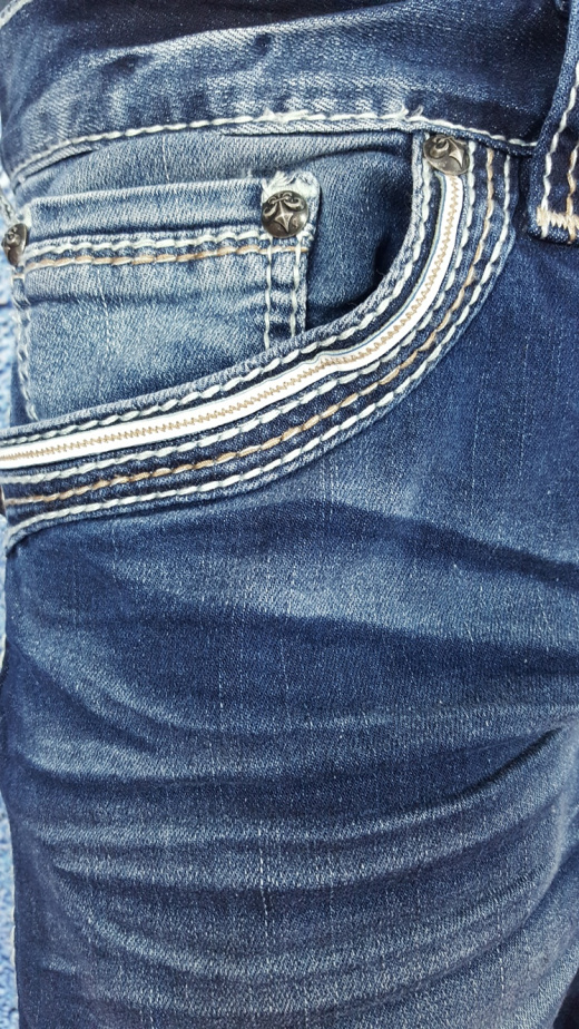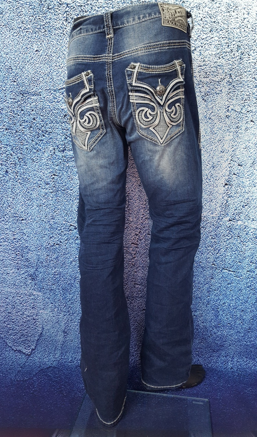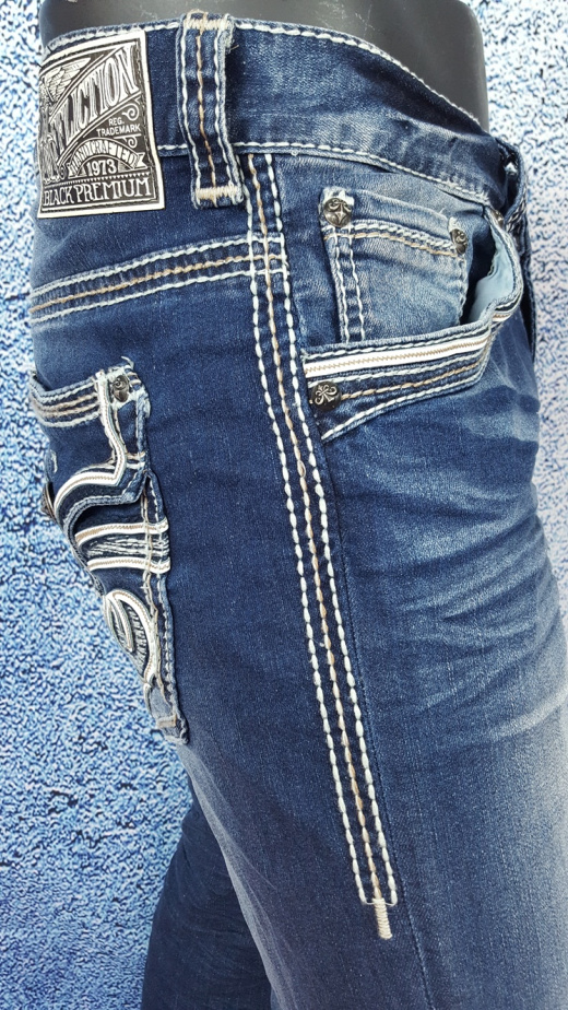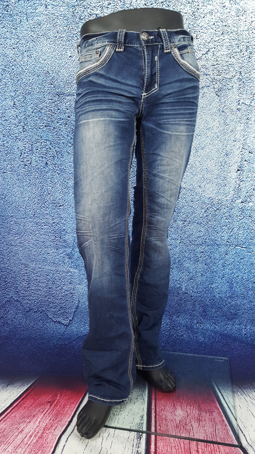 Amerikanische Jeans mit weissen Ziernähten und auffälligem Design finden