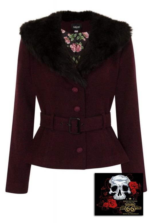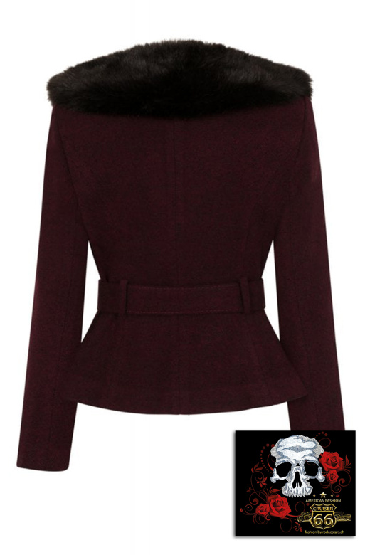 Hergestellt ist die bordeauxrote Jacke aus einer warmen Wollmischung. Abgefüttert ist sie mit einem blumigen, satin-ähnlichen Stoff.