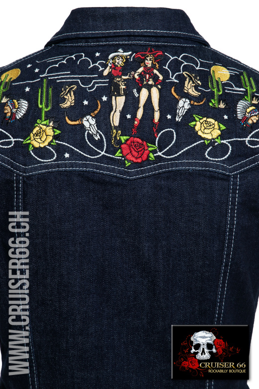 The Vintage Way of the Wild West - Mit diesem unverkennbaren Swing Jeanskleid bestehend aus hochwertigen "Western" Stickereien im Bereich der Schulterblätter und Schlüsselbein präsentiert Queen Kerosin ein Highlight der originalen Vintage Kultur.