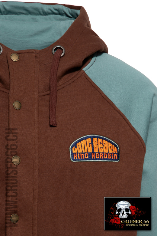 Funktionalität trifft auf Ästhetik: Der durchgehende Reißverschluss, sicher abgedeckt durch eine Knopfleiste mit matten Metallknöpfen, verspricht nicht nur Schutz, sondern unterstreicht auch die authentische Retro-Note. Der höher geschnittene Kragen schützt vor Wind, während die Metallösen an der Kapuze mit Kordelzug robusten Charme verleihen. Die Eingrifftaschen mit Reißverschlüssen sind nicht nur ein sicheres Versteck für deine Wertsachen, sondern bewahren auch die schlanke Linie der Jacke. Die Brust ziert eine exquisite Stickerei, die die Seele von Long Beach und King Kerosin einfängt und dich als Kenner auszeichnet. Die gerippten Ärmelbündchen in Braun sorgen für eine perfekte Passform und runden das Gesamtbild ab.