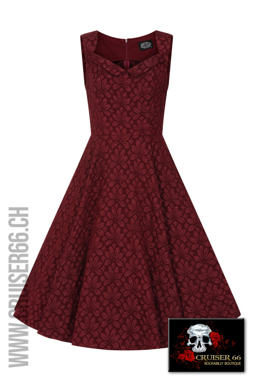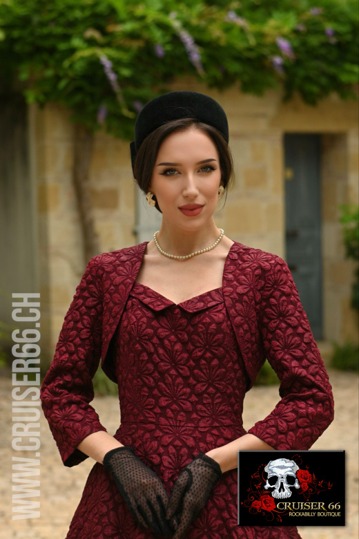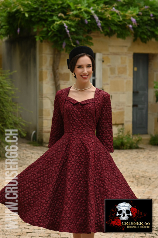 Treten Sie in zeitlose Eleganz ein mit unserem vintage-inspirierten Thea Swing Kleid mit Bolero, das in einem reichen Weinton gehalten und mit einem exquisiten geprägten Blumenmuster verziert ist.