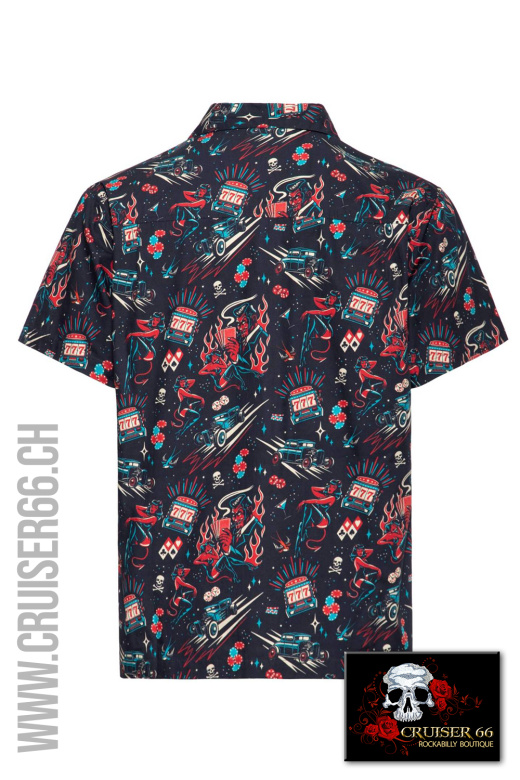 Der auffällige Allover-Print mixt Hotrods, Pin-up-Teufelinnen, Slot-Machines und Skull-Motive zu einem wilden Retro-Cocktail – wie gemacht für Zocker, Rebels und Glücksritter.