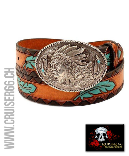 Schnalle mit Indianersujet, Wolf, Federn und Türkis Steinen