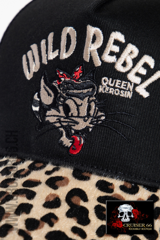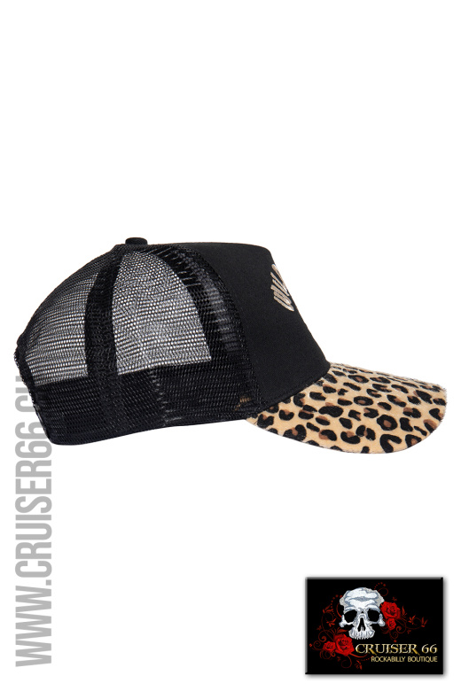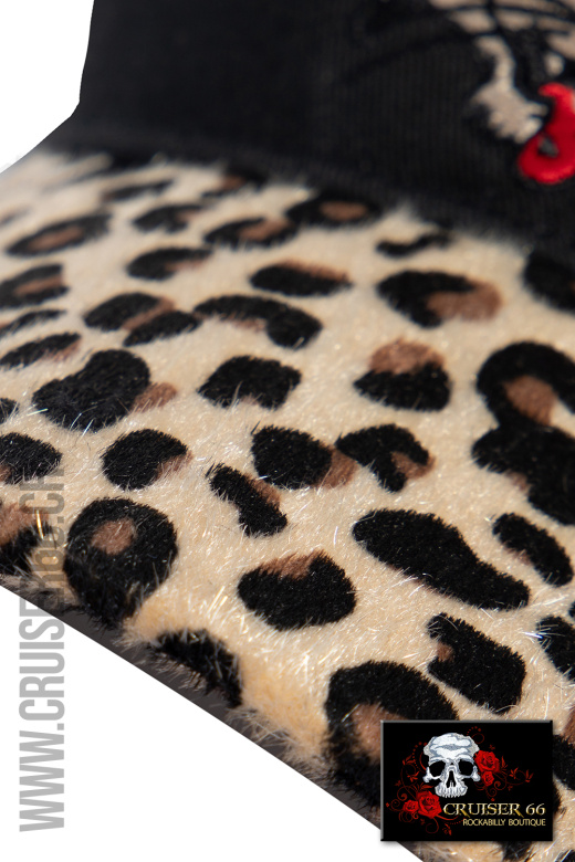 Die Front der Kappe ist mit einer auffälligen Logostickerei und der feste, gebogene Schirm mit einem wilden Leopardenfell verziert.