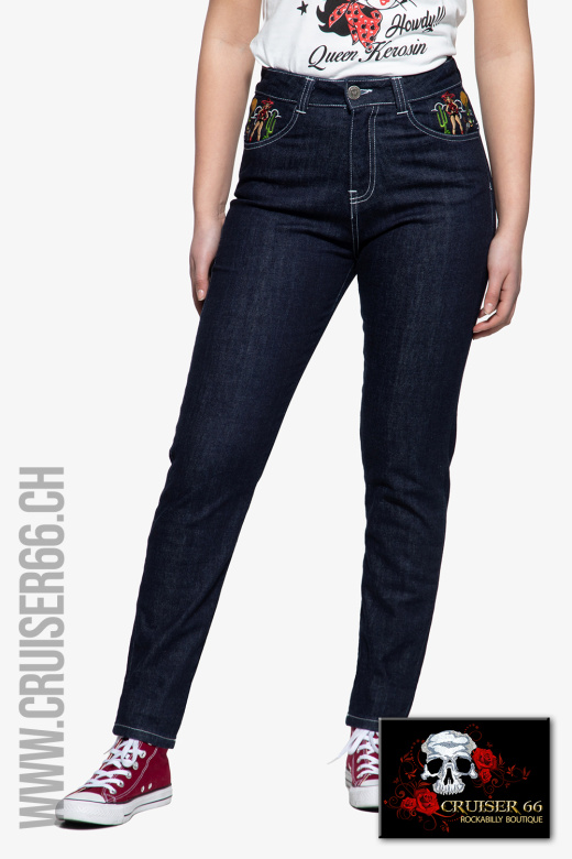 Die Queen Kerosin Western Jeanshose vereint das 50's Western Design mit hochwertigen Stickereien vorne und hinten. Die Hose hat Eingrifftaschen und Gesäßtaschen, die Platz für deine wichtigsten Utensilien bieten. Die Washed-Optik verleiht der Hose einen wilden Western-Look, der perfekt zu deinem Rockabilly-Style passt. Der Slim Fit sorgt dafür, dass die Hose eng anliegt und Deine Figur betont.