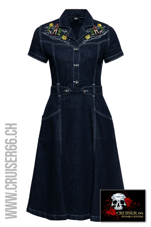 The Vintage Way of the Wild West - Mit diesem unverkennbaren Swing Jeanskleid bestehend aus hochwertigen "Western" Stickereien im Bereich der Schulterblätter und Schlüsselbein präsentiert Queen Kerosin ein Highlight der originalen Vintage Kultur.