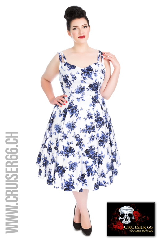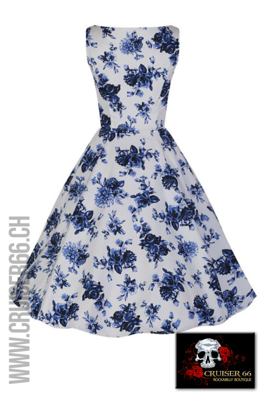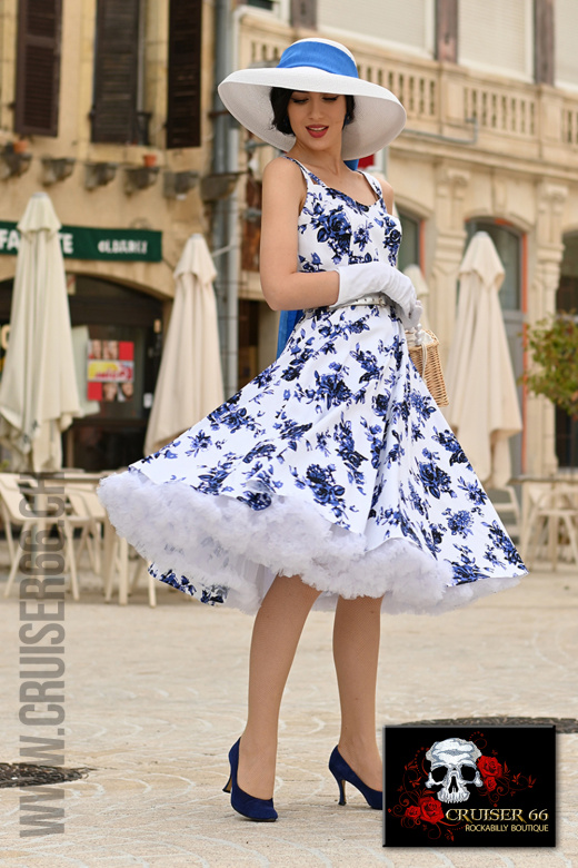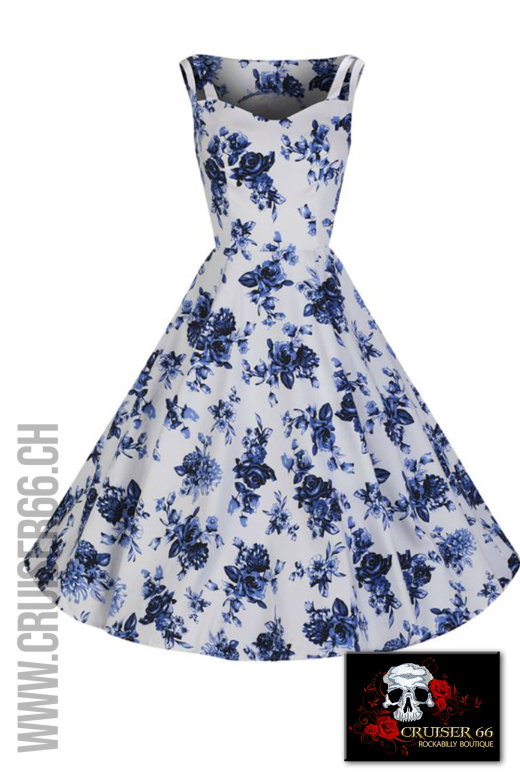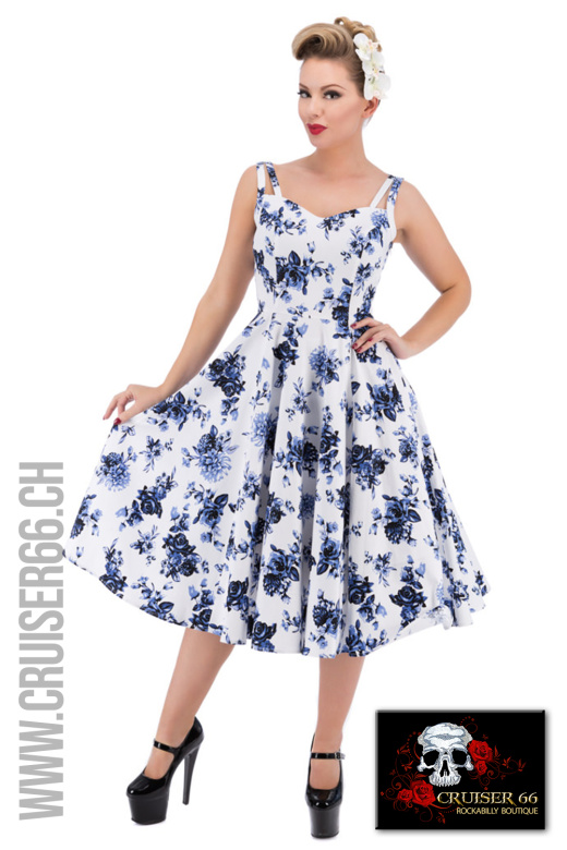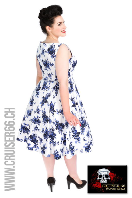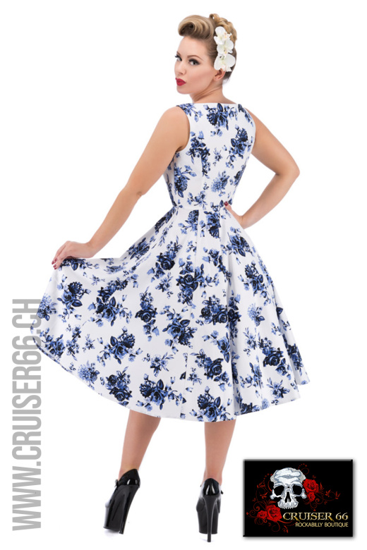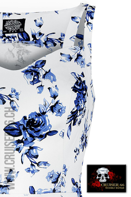 Das Blue Roses Swing-Kleid ist ein Träger-Swingkleid mit Aussparungen an den Trägern, ein Sweetheart Ausschnitt und ein hochgeschlossener Rückenteil. Der Swingrock gibt dem Kleid den Vintagelook, ein Stiel der niemals vergeht.