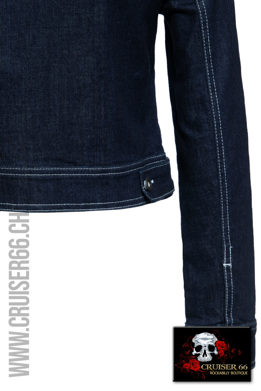 Mit dieser Jeansjacke schickt Queen Kerosin einen Classic Allrounder in Vintage Neuauflage an den Start. Das typisch dunkle Denim besticht vor allem durch seine charakteristische Retro Stickerei im Rockabilly "Western Style". Markant gesetzte Kontrastnähte betonen das authentische Design sowie die Vorzüge der femininen Silhouette. Der taillierte Crop-Cut macht Sie zu einem legeren und zeitgleich sexy Must-have in deiner Garderobe.