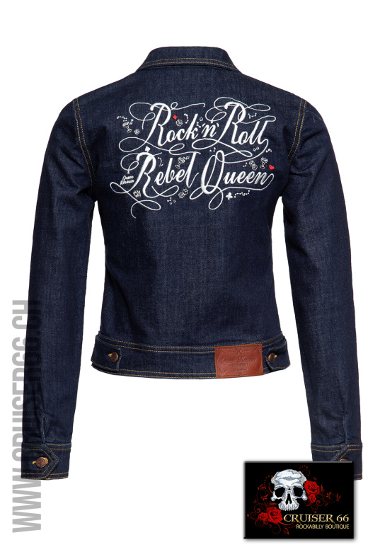 Das typisch dunkle Denim sticht besonders durch seine exklusive Retro Stickerei auf dem Rücken hervor. Markant gesetzte Kontrastnähte betonen das authentische Design, sowie die Vorzüge der femininen Silhouette. Der taillierte, dezente Crop-Cut macht Sie zu einem lässigen, sexy It-Piece in deiner authentischen Rockabilly Kollektion.