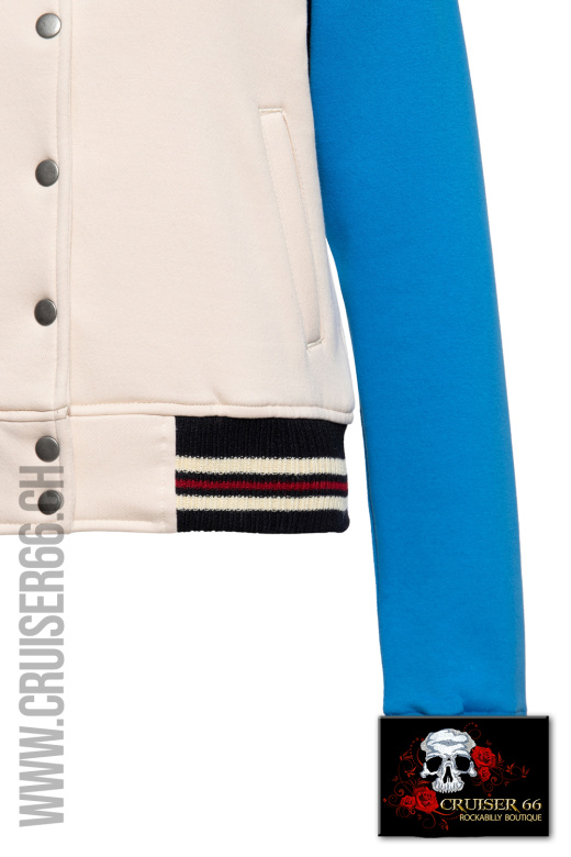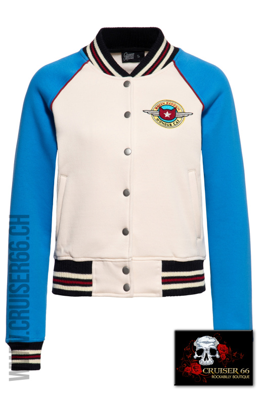 Wie bei allen Queen Kerosin College-Jacken schaffen auch hier die kontrastfarbenen Ärmel und elastischen Rippbündchen eine zeitlose Balance aus Sportlichkeit und femininem Chic. Für den Alltag oder deine nächste Abenteuermission sind die praktischen Eingrifftaschen und die metallene Druckknopfleiste perfekte Begleiter.