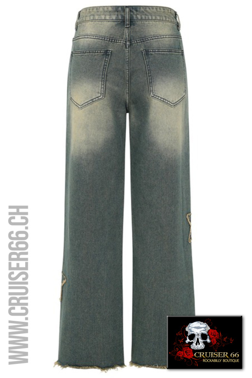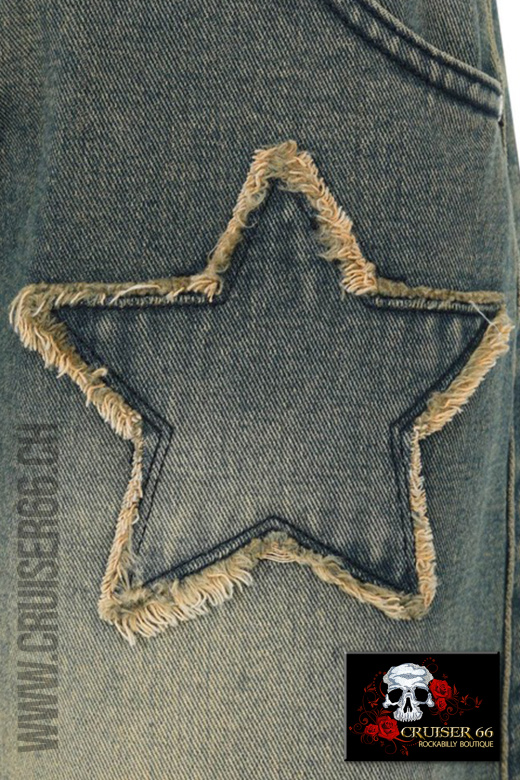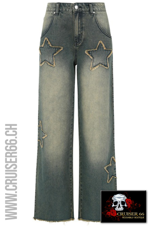 Diese Jeans haben eine unverwechselbare rostige orange Farbe mit orangefarbenen Verwaschungen an den Saumkanten und den Rändern der Sterne, die als bunter Rand fungieren. Diese großen Sternenapplikationen sind über die Jeans verteilt und bilden ein einzigartiges Muster. Diese Jeans haben auch eine lässige und entspannte Passform, sodass sie perfekt für ein lässiges und bequemes Outfit sind. Diese Jeans sidn perfekt für einen Tagesausflug oder einen Abend, an dem man sich schick macht – kontrastieren Sie sie mit einem eng anliegenden Oberteil für eine lustige Silhouettenänderung.
