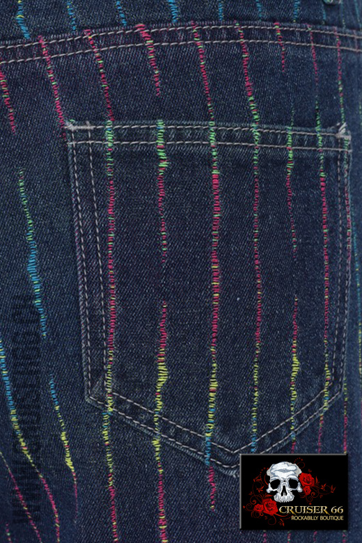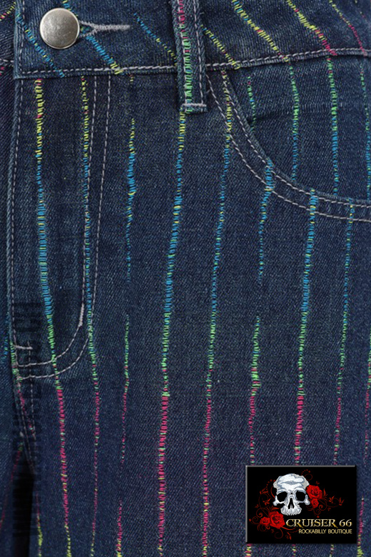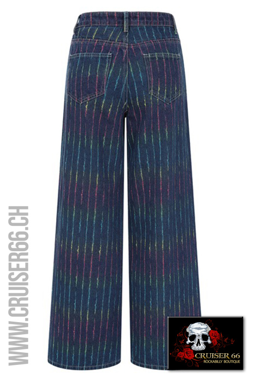 Genießen Sie diese verbotenen, bodenlangen Regenbogen-Streifen-Jeans mit Regenbogen-Stichen, die die gesamte Jeans umsäumen.