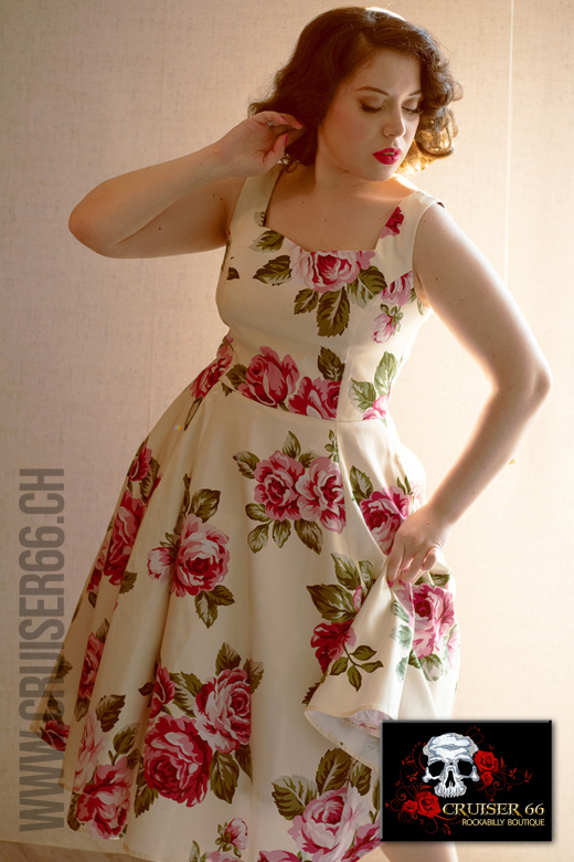 Der Sweetheart Ausschnitt passt zur süssen Natur von diesem Kleid, zusammen mit dem anliegenden Oberteil und dem grosszügigen Swing Rock sorgt er für zusätzliche Spannung.
