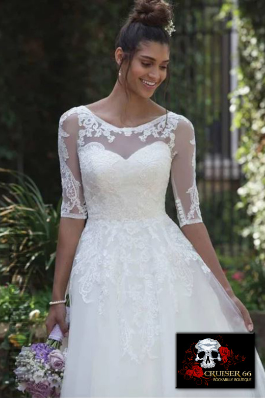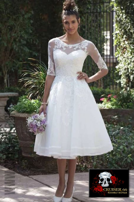 Romantisches Kleid im Stiel der 50er Jahre mit weitem Swingrock und elegantem Oberteil. Edel wirkt die fein gearbeitete Spitze über die Hüfte.