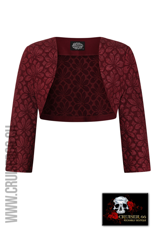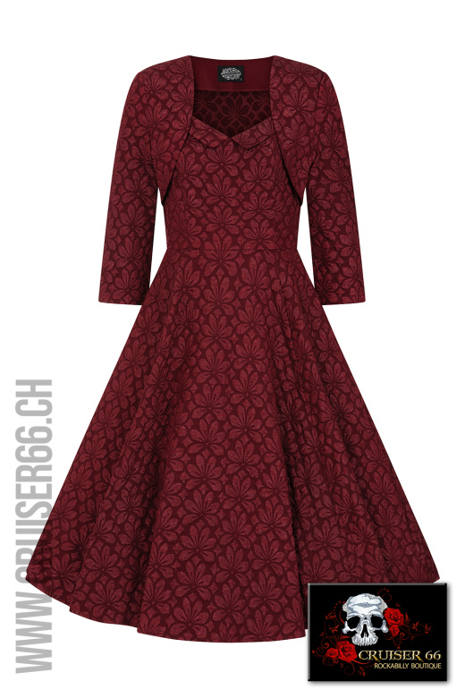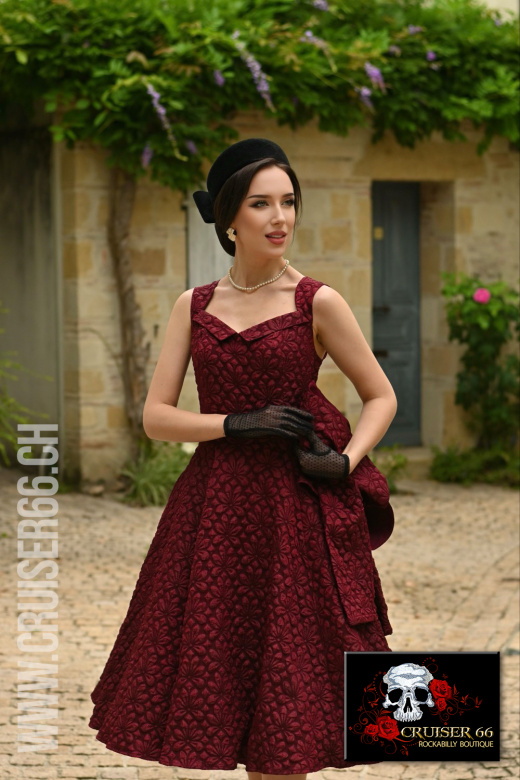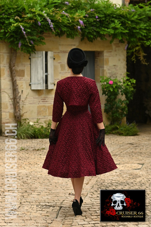 Treten Sie in zeitlose Eleganz ein mit unserem vintage-inspirierten Thea Swing Kleid mit Bolero, das in einem reichen Weinton gehalten und mit einem exquisiten geprägten Blumenmuster verziert ist.