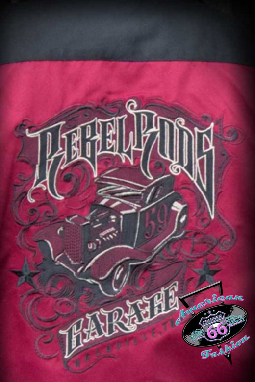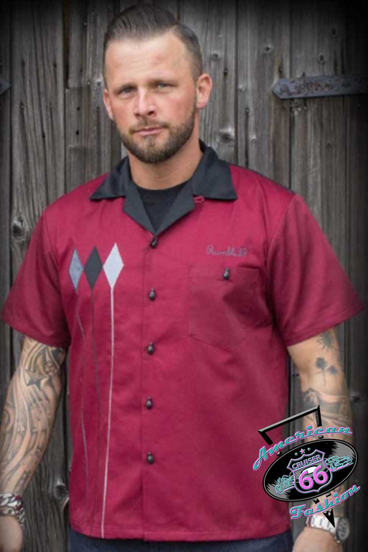 Das Bowling Shirt "Rebel Rods" ist kontrastig in bordeauxrot/schwarz