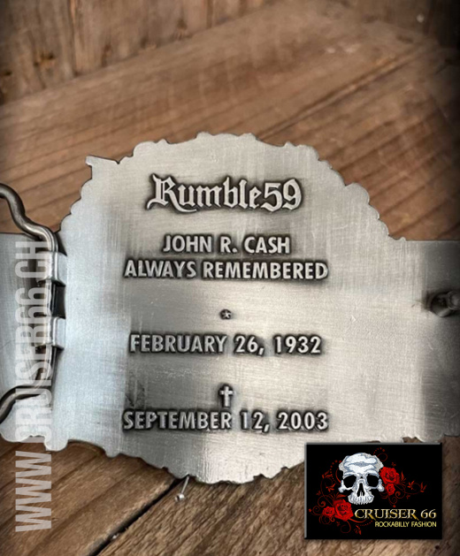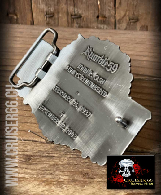 Die Front dieses Buckles zeigt sich detailliert mit feinen Schnörkeln in der Grundplatte sowie Schriftzügen in unterschiedlichen Größen und Prägetiefen. Den Mittelpunkt bildet die Silhouette Cashs, einen Gitarrenkoffer tragend - das wohlbekannte Motiv des Innencovers der Platte "American Recordings".