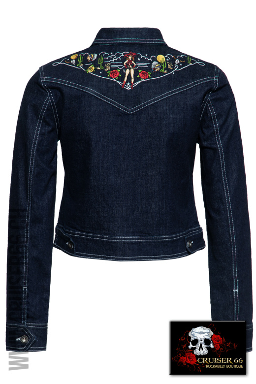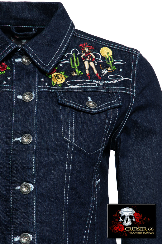 Mit dieser Jeansjacke schickt Queen Kerosin einen Classic Allrounder in Vintage Neuauflage an den Start. Das typisch dunkle Denim besticht vor allem durch seine charakteristische Retro Stickerei im Rockabilly "Western Style". Markant gesetzte Kontrastnähte betonen das authentische Design sowie die Vorzüge der femininen Silhouette. Der taillierte Crop-Cut macht Sie zu einem legeren und zeitgleich sexy Must-have in deiner Garderobe.