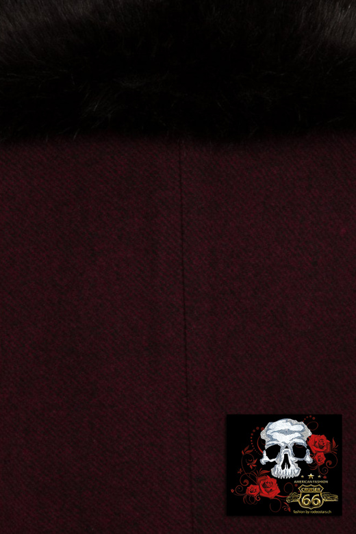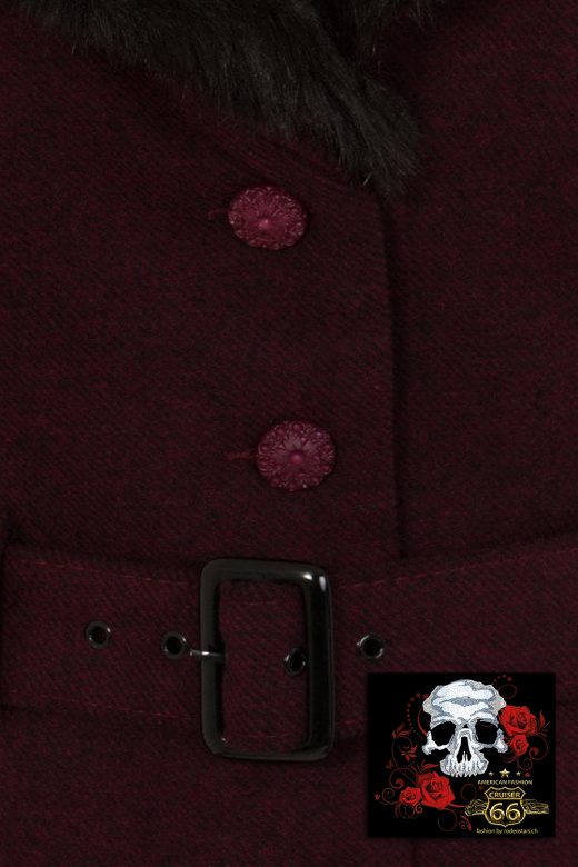 Hergestellt ist die bordeauxrote Jacke aus einer warmen Wollmischung. Abgefüttert ist sie mit einem blumigen, satin-ähnlichen Stoff.