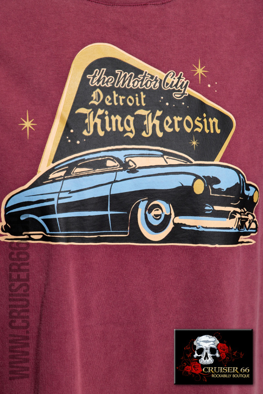 Das neue King Kerosin Oil-Wash T-Shirt entführt dich in die pulsierende Welt der 50er Jahre, wo Greaser die Straßen beherrschten. Mit einem stimmungsvollen Print eines Kultautos der 50er erweckt dieses Shirt ein Gefühl der Nostalgie und des Retro-Charmes.