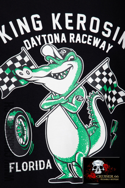 Das King Kerosin T-Shirt setzt mit seinem markanten Racing-Artwork ein klares Zeichen. Das freche Krokodil mit Zielflaggen bringt Motorsport-Vibes, Cartoon-Charme und eine Portion Florida-Rennstrecke direkt auf die Brust.
