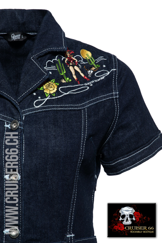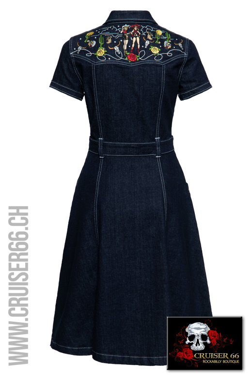 The Vintage Way of the Wild West - Mit diesem unverkennbaren Swing Jeanskleid bestehend aus hochwertigen "Western" Stickereien im Bereich der Schulterblätter und Schlüsselbein präsentiert Queen Kerosin ein Highlight der originalen Vintage Kultur.