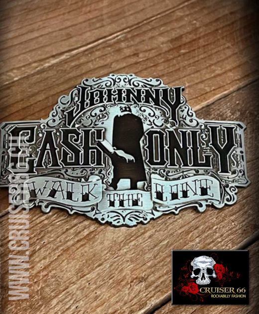 Die Front dieses Buckles zeigt sich detailliert mit feinen Schnörkeln in der Grundplatte sowie Schriftzügen in unterschiedlichen Größen und Prägetiefen. Den Mittelpunkt bildet die Silhouette Cashs, einen Gitarrenkoffer tragend - das wohlbekannte Motiv des Innencovers der Platte "American Recordings".